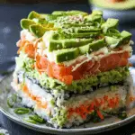 This Avocado Layered Sushi Cake is a no-bake, visually stunning dish that combines classic sushi flavors—tangy rice, creamy avocado, fresh fish, and crisp vegetables—in elegant, savory layers perfect for entertaining.