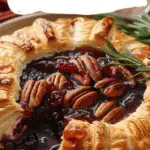 This Baked Brie With Puff Pastry, Cranberry‑Pepper Jelly, and Pecans is an elegant yet easy appetizer featuring creamy brie wrapped in golden puff pastry, topped with sweet-spicy jelly and crunchy pecans for a melty, crowd-pleasing bite.