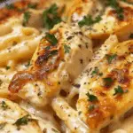 A comforting baked pasta dish featuring tender chicken, creamy sauce, and melty mozzarella cheese, perfect for a family dinner.