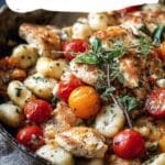 Caprese Chicken Gnocchi Skillet is a one-pan meal combining juicy chicken, tender gnocchi, cherry tomatoes, and creamy mozzarella with fresh basil and optional balsamic glaze. It’s quick, comforting, and packed with Caprese-inspired flavor.