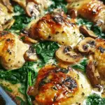A creamy, cheesy low-carb oven dish featuring juicy chicken breasts baked with sautéed spinach and mushrooms in a garlic-infused cream sauce—perfect for a satisfying and healthy one-pan meal.