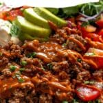 I store the cooked beef and toppings separately in airtight containers in the fridge for up to 4 days. When I’m ready to eat, I reheat the beef in the microwave or on the stove and assemble the bowl fresh with cold toppings. The sauce keeps well for several days too—just give it a quick stir before using.