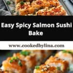 This Easy Spicy Salmon Sushi Bake serves 4–6 people. Prep time is about 20 minutes, bake time is about 15 minutes, and total time is around 35 minutes.