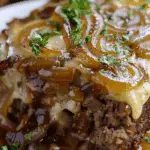 A hearty meatloaf inspired by French onion soup, featuring juicy ground beef, sweet caramelized onions, and gooey Swiss cheese. Perfect for cozy family dinners or comforting gatherings.