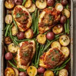 A wholesome sheet pan dinner featuring crispy baked chicken breasts topped with marinara sauce and melted cheese, offering classic flavors with a healthy twist.