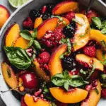 A bright and refreshing summer fruit salad featuring juicy peaches, sweet berries, and fresh basil, all tossed in a honey-lime dressing for a sweet-tangy, aromatic bite.