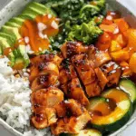 - Assemble the bowls: add rice to each bowl and top with glazed chicken, cucumber, cherry tomatoes, shredded carrots, avocado, and pickled onions.