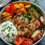 This Loaded Herb Chicken & Veggie Bowl with Garlic Yogurt Sauce is a nourishing, flavor-packed meal featuring tender herb-marinated chicken, roasted vegetables, fluffy grains, and a creamy garlic yogurt sauce that ties everything together beautifully.