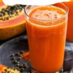 I store any leftover juice in a covered jar or bottle in the refrigerator for up to 24 hours. I give it a good stir or shake before serving. I never reheat papaya juice—it’s meant to be served chilled. Papaya Juice