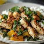 - Slice chicken and serve over quinoa topped with sautéed veggies and a squeeze of lemon juice.