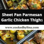 Sheet Pan Parmesan Garlic Chicken Thighs are a deliciously easy one-pan dinner featuring juicy, crispy-skinned chicken thighs coated in a savory parmesan-garlic crust. Roasted alongside your favorite vegetables, this meal is bold in flavor and low on cleanup.