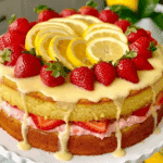 A moist, tangy-sweet cake made with buttermilk and lemon zest, dotted with fresh strawberries, and finished with a bright lemon glaze for a perfect spring or summer treat.