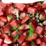 I store leftovers in the refrigerator for up to 1 day, though I prefer enjoying it fresh for the best texture. I don’t reheat this salad, as it’s meant to be served cold.Strawberry Watermelon Salad With Refreshing Honey