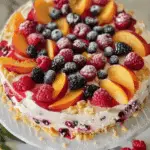 This summer berry and peach cheesecake is a creamy, fruity dessert with a buttery graham cracker crust, smooth cheesecake filling, and a fresh topping of peaches and mixed berries.