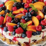 A creamy, velvety cheesecake topped with fresh peaches, juicy summer berries, and a glossy fruit glaze—perfect for warm-weather celebrations.