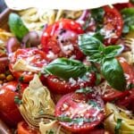 - In a large bowl, combine halved cherry tomatoes, quartered artichoke hearts, sliced red onion, and chopped basil.