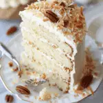 This White German Chocolate Cake replaces the traditional dark chocolate base with a moist white cake, paired with a rich coconut-pecan frosting for a delicious twist on a classic dessert.